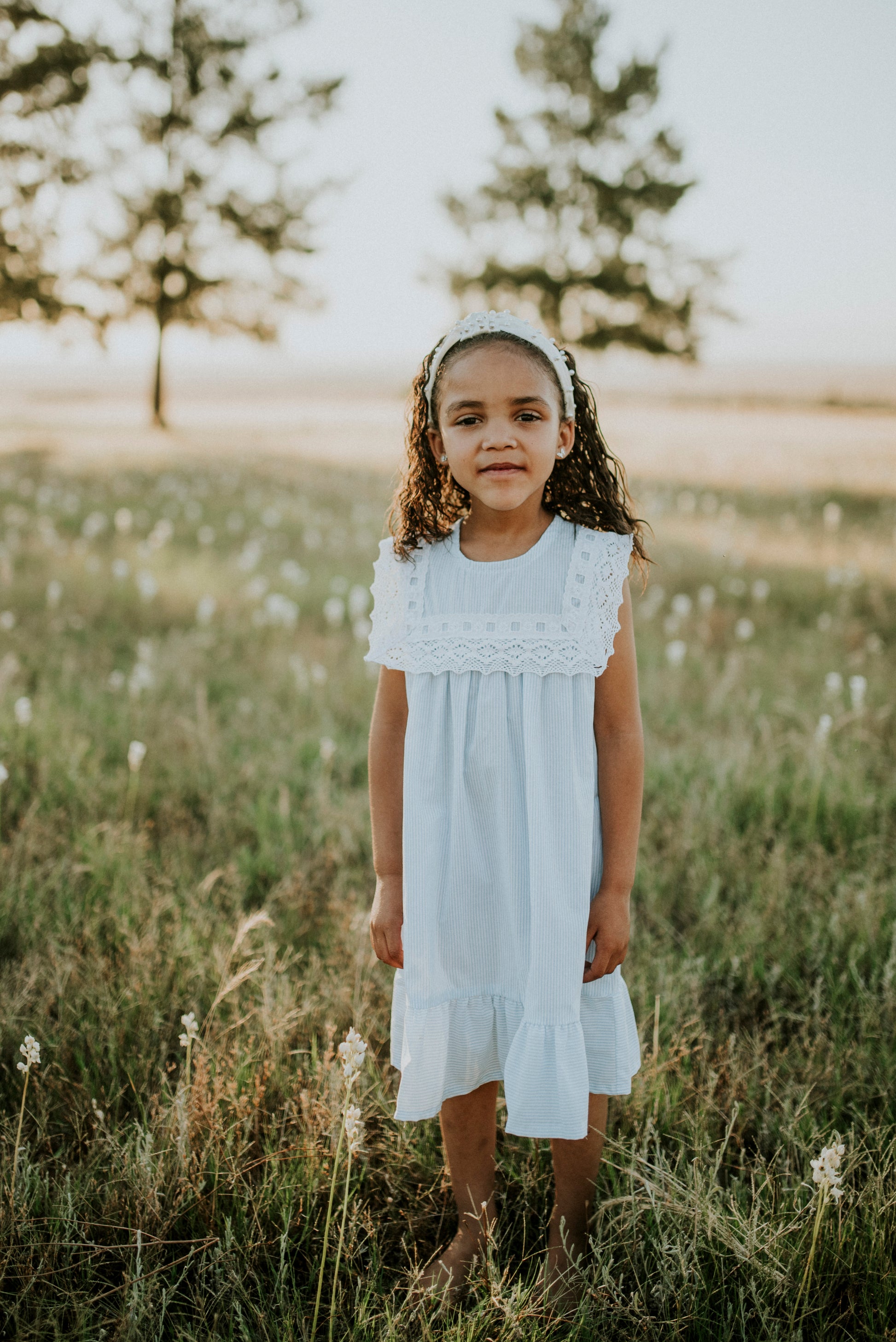 Model in the blue and white stripes dress is wearing a size 6-7 years.